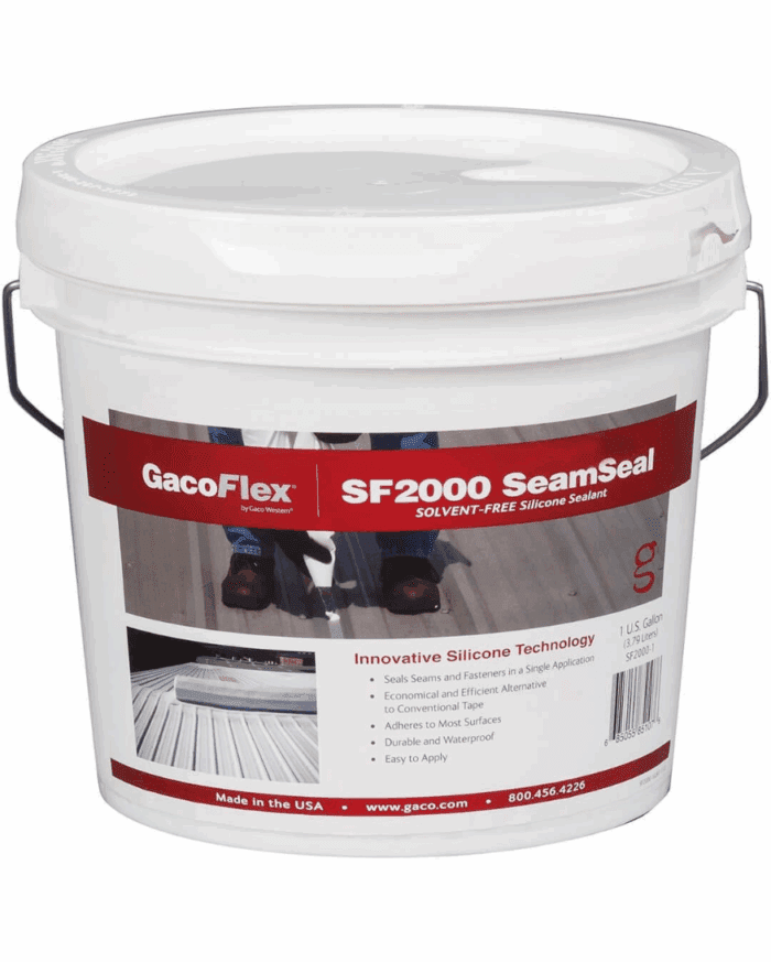 GacoFlex SeamSeal, a silicone-based, solvent-free sealant combined with a reinforcing agent, adheres to seams, fasteners and other roof details in a single application. GacoFlex SeamSeal transforms a roof with seams, gaps, and overlaps into a seamless foundation ready for coating with GacoFlex Solvent-Free 100% Silicone Coating.
