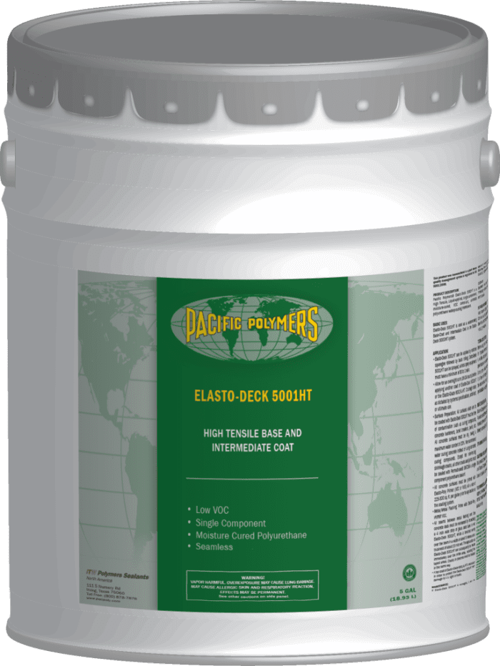 GacoPoly Elasto-Deck 5001 HT (High Tensile) is a single-component aromatic urethane, liquid-applied traffic coating designed as a concrete gray colored basecoat or intermediate coat on Elasto-Deck 5000 HT System for vehicular traffic parking decks where a skid-resistant, long-lasting surface is required. It is the ideal moisture-cured polyurethane for vehicular to build the body of the deck systems over plywood and concrete applications. Except for non-moving shrinkage cracks, all other cracks and joints must be sealed with SM7120 PU. All concrete substrates and metal/metal flashing surfaces must be primed with Elasto-Poxy Primer. It must be top coated with GacoPoly Elasto-Glaze 6001 AL-HT to achieve UV stability and protect against heavy vehicular traffic. Elasto-Deck 5001 HT is VOC compliant in all 50 states.
