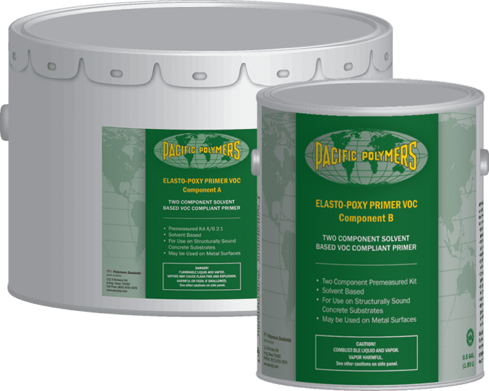 GacoPoly Elasto-Poxy Primer VOC is a two-component, epoxy, solvent-based primer designed to promote adhesion for the GacoPoly polyurethane traffic coating systems and the below-grade waterproofing membrane systems. The primer creates a durable, tough film over concrete, plywood and metal substrates. It may also be used as an interlaminary primer for deck and membrane re-coats. If coating over a sound and well-adhered acrylic system, prime with Elasto-Poxy Primer WB (Water-Based).
